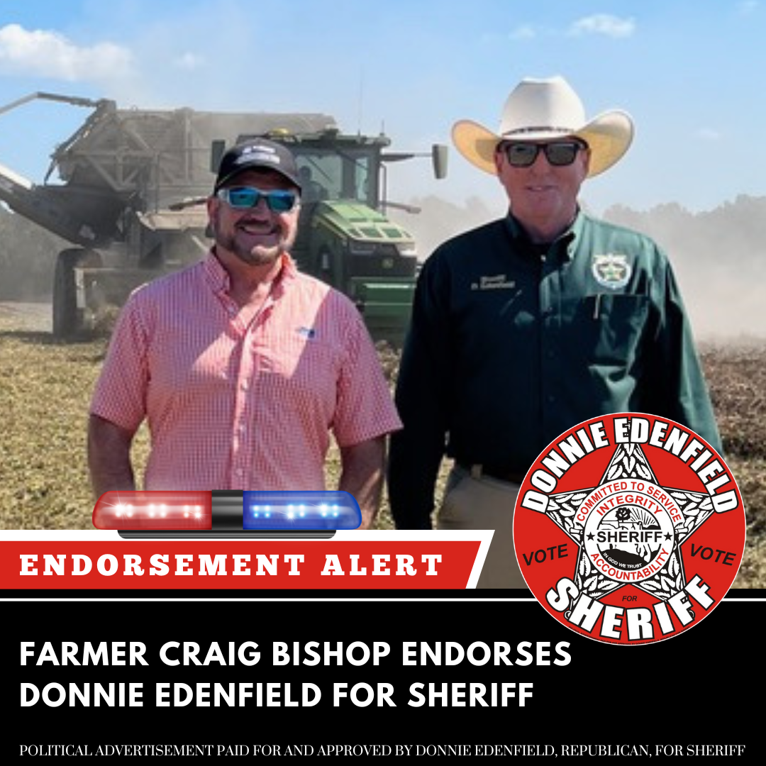 "Join me in supporting Sheriff Donnie Edenfield for Re-Election as Sheriff of Jackson County. Sheriff Edenfield is not only a dedicated Sheriff, but he is also a strong supporter of farmers. He understands that without farmers, we don’t have food on our tables. Sheriff Edenfield is committed to preserving the agricultural heritage of Jackson County each and every day. He and his team have investigated and solved many crimes committed against farmers, and they do not stand for farmers to be taken advantage of by criminals. I ask that you join me in supporting Sheriff Edenfield and voting for him on November 5th."