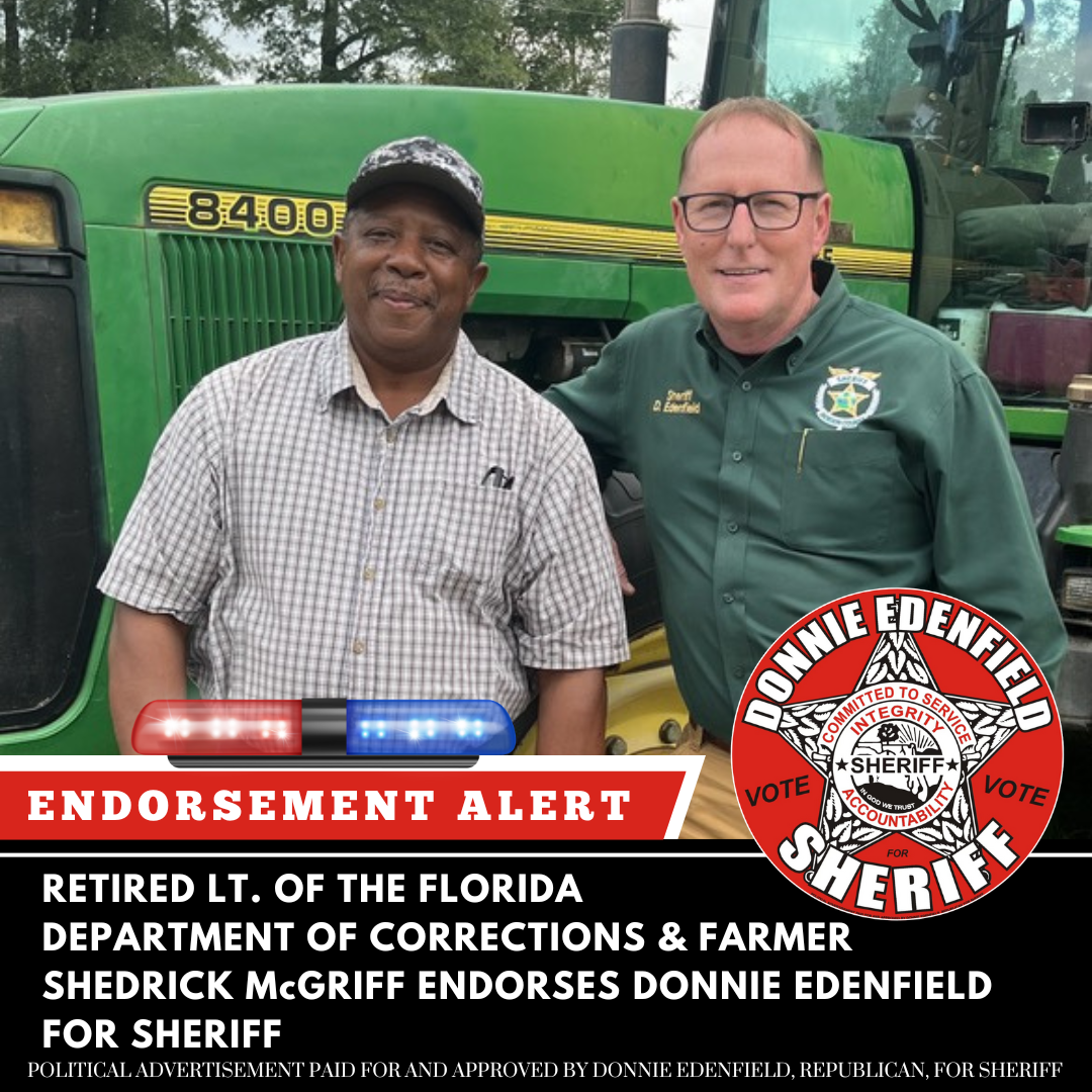 “I am John McClendon, a lifelong resident of Jackson County and currently seated Commissioner for the City of Graceville. I am proud to endorse Sheriff Donnie Edenfield in his re-election Campaign for Jackson County Sheriff. I have known Donnie for over twenty years and feel confident that he will continue to serve Jackson County and its Citizens.